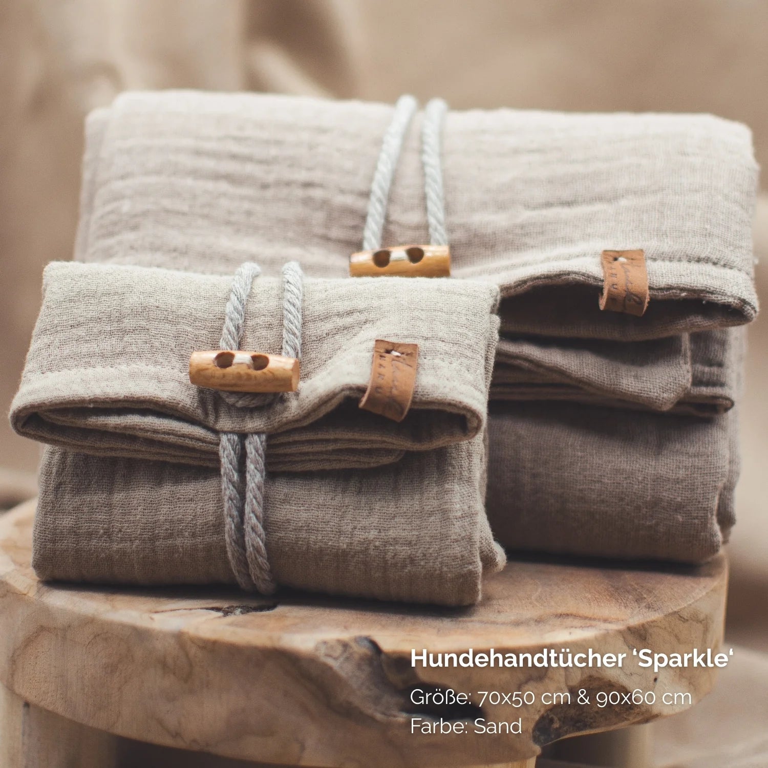 Gleichzeitig wird auch die Baumwolle-Kordel genutzt um das Hundehandtuch zu falten und an dem angebrachten Holzknebel im Vintage-Look zu befestigen.