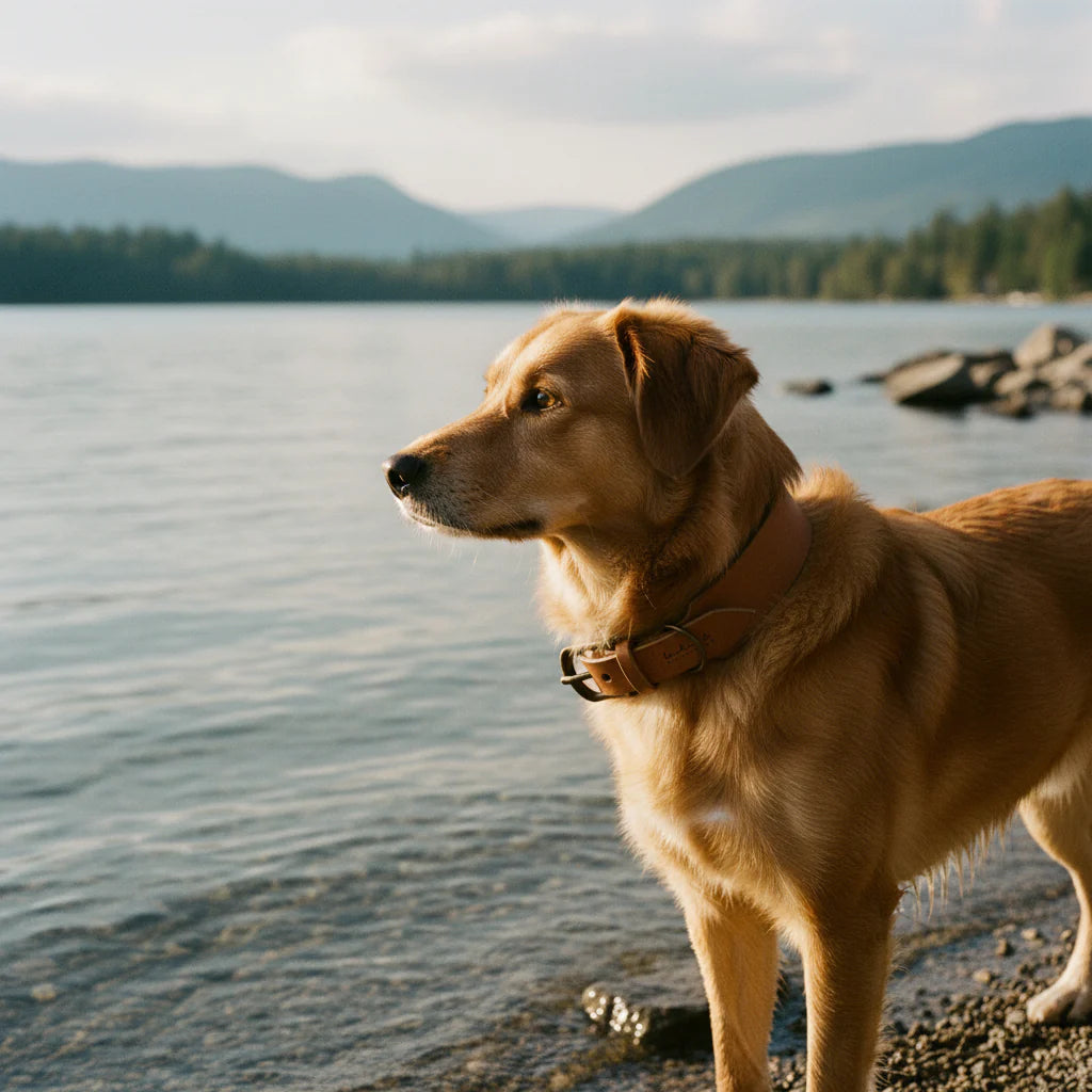 Das Lederhalsband in der Farbe Cognac aus der ‚Waldgeist‘ Kollektion wird in unserer Münchner Manufaktur in traditioneller Handarbeit gefertigt.