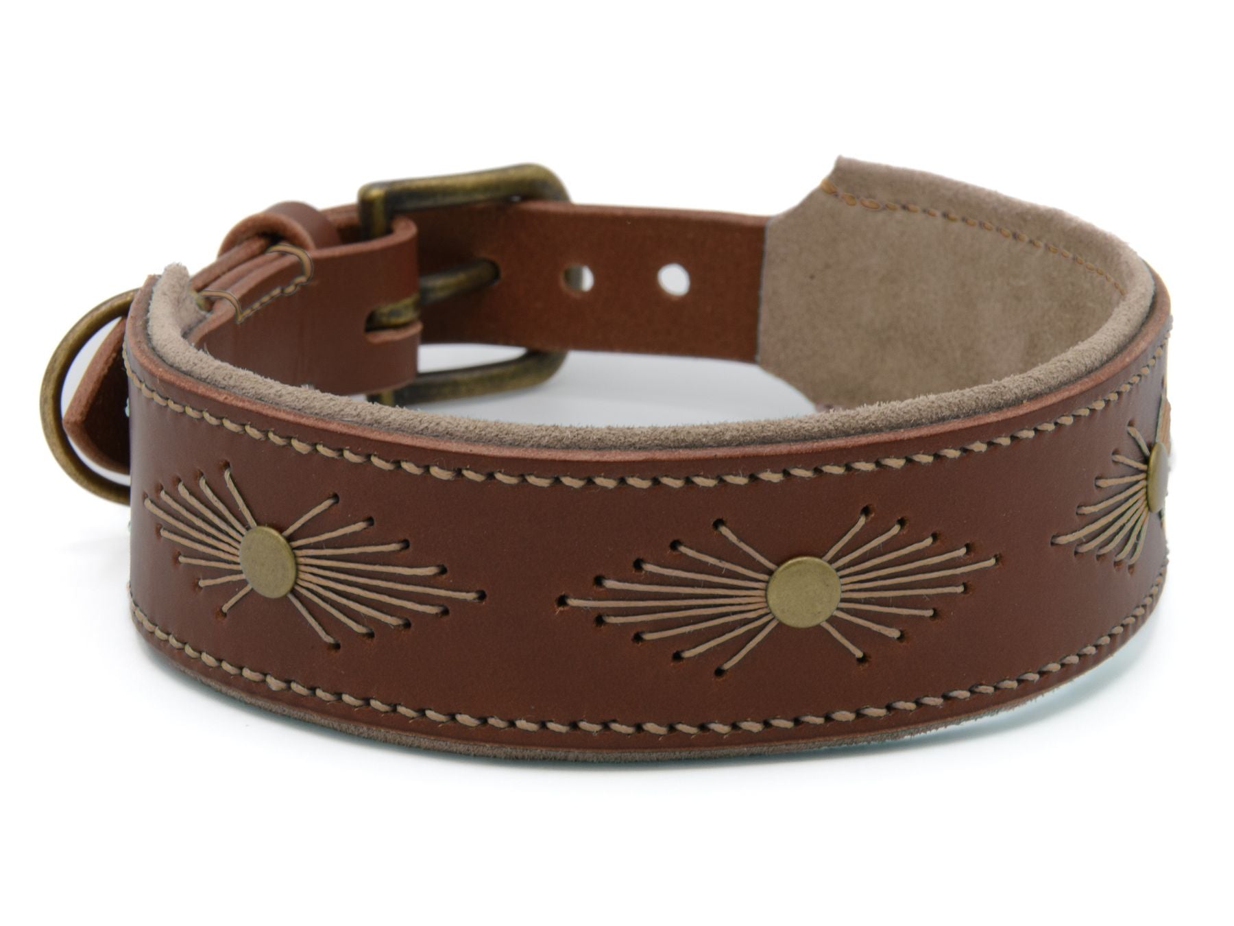 Das gepolsterte Lederhalsband für Hunde in der Farbe Braun aus der 'Woodstock' Kollektion bringt den Spirit von Woodstock ins Hier und Jetzt – mit floraler Stickerei aus feinem Leinengarn, Hippie-Charme und ganz viel Liebe zum Detail.