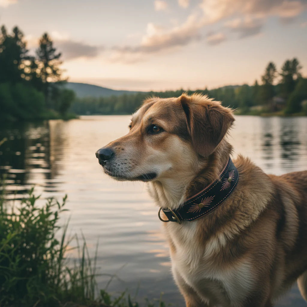 Das gepolsterte Lederhalsband für Hunde in der Farbe Schwarz aus der 'Woodstock' Kollektion bringt den Spirit von Woodstock ins Hier und Jetzt – mit floraler Stickerei aus feinem Leinengarn, Hippie-Charme und ganz viel Liebe zum Detail.