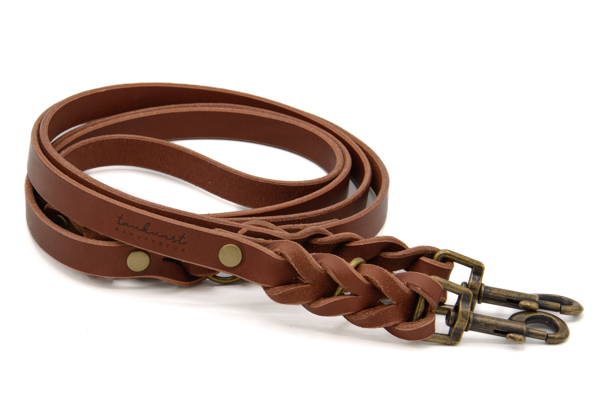 Die Lederleine in der Farbe Braun aus der ‚Waldstreuner‘ Kollektion wird in unserer Münchner Manufaktur in traditioneller Handarbeit gefertigt.