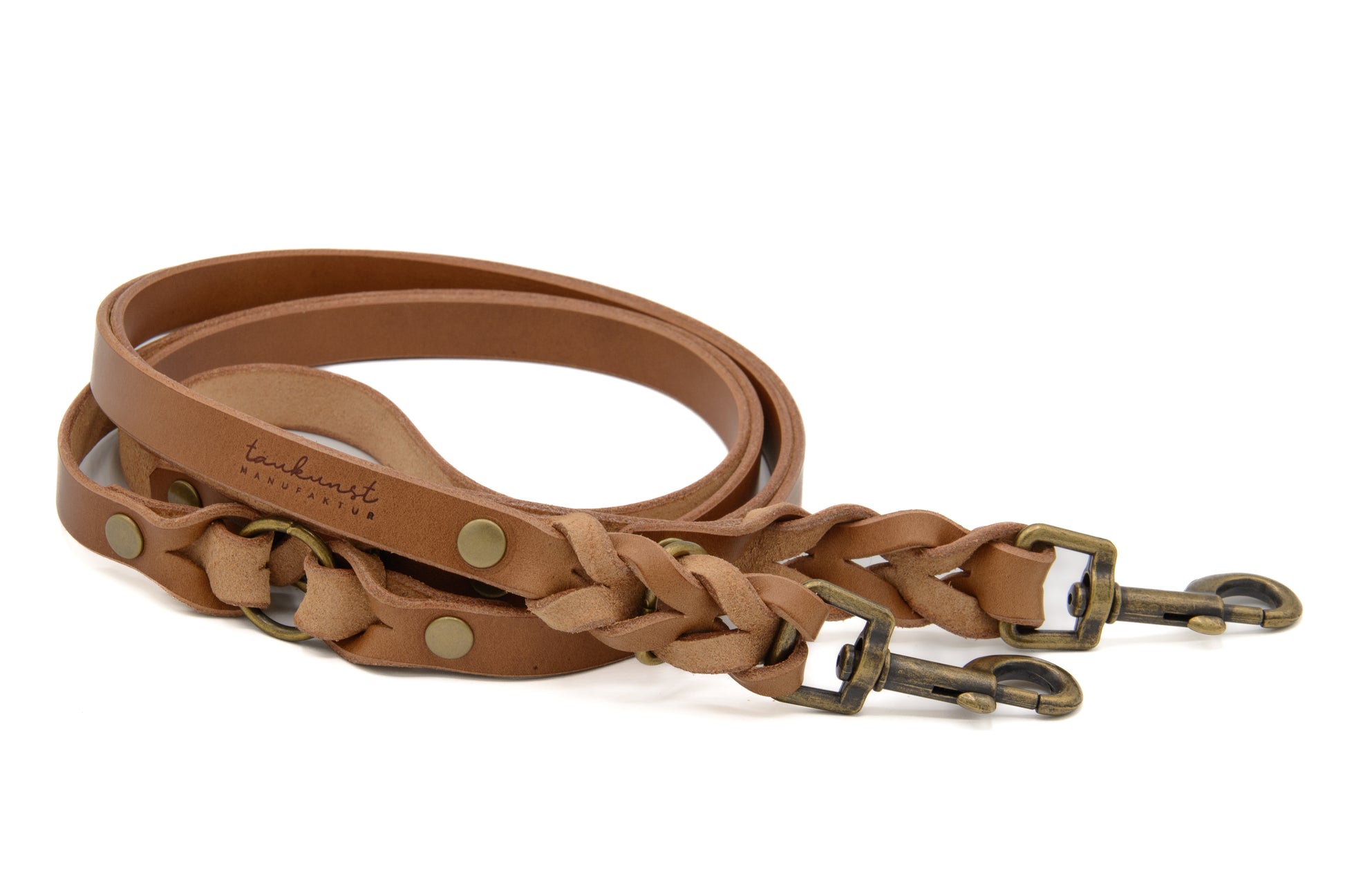 Die Lederleine in der Farbe Camel aus der ‚Waldstreuner‘ Kollektion wird in unserer Münchner Manufaktur in traditioneller Handarbeit gefertigt.
