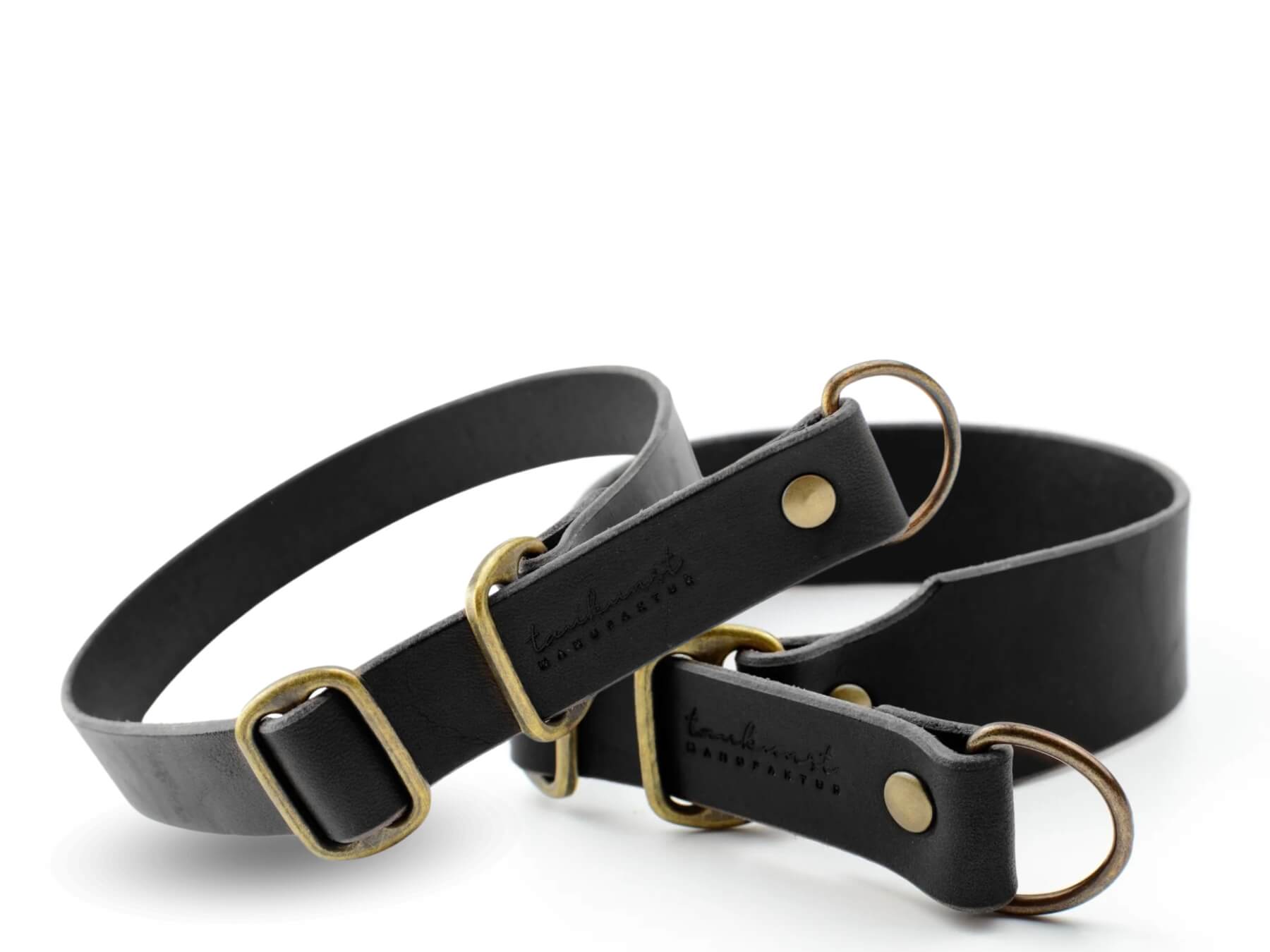 Das Zugstopp Lederhalsband in der Farbe Schwarz aus der ‚Waldstreuner‘ Kollektion wird in unserer Münchner Manufaktur in traditioneller Handarbeit gefertigt.