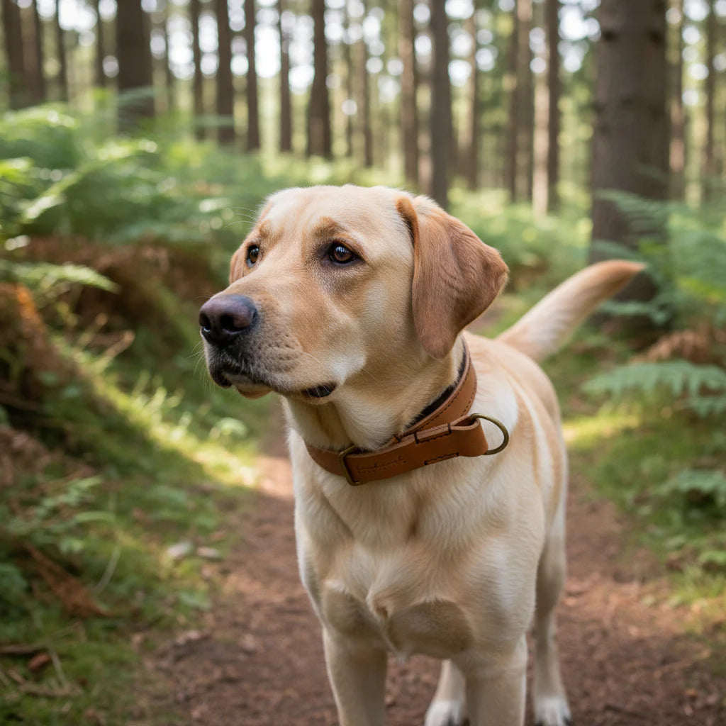 Das gepolsterte Zugstopp Lederhalsband in der Farbe Cognac aus der ‚Wildfang‘ Kollektion wird in unserer Münchner Manufaktur in traditioneller Handarbeit gefertigt.